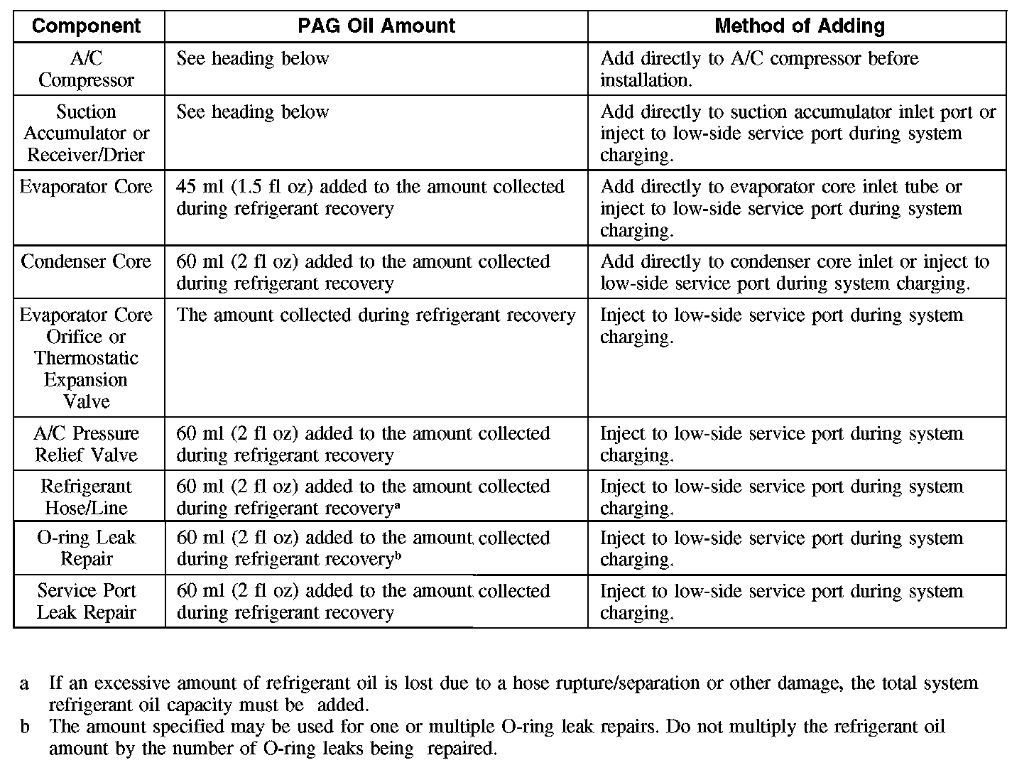 CAUTION: During normal A/C operation, oil is circulated through the system with the refrigerant, and a small amount is retained in each component. If certain components of the system are removed, some of the refrigerant oil will go with the component. To maintain the original total oil charge, it is necessary to compensate for the oil lost by adding oil to the system with the new part.
