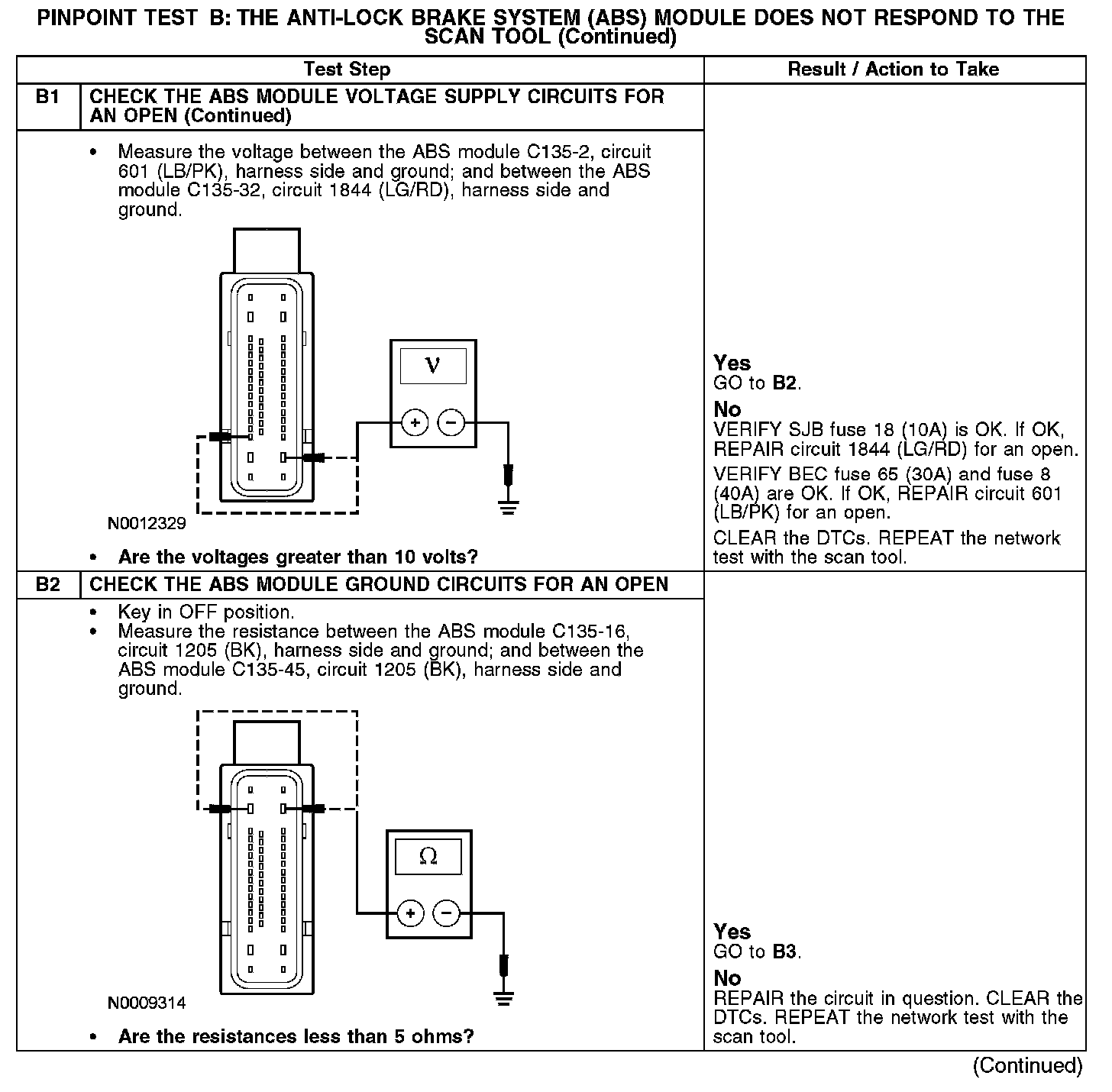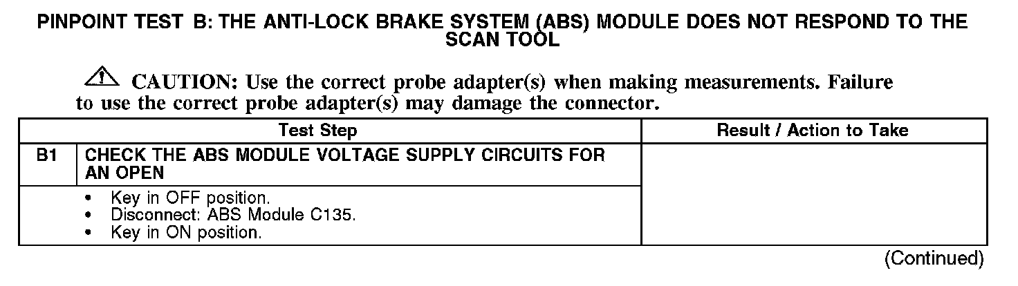 PINPOINT TEST B: THE ANTI-LOCK BRAKE SYSTEM (ABS) MODULE DOES NOT RESPOND TO THE SCAN TOOLB1: