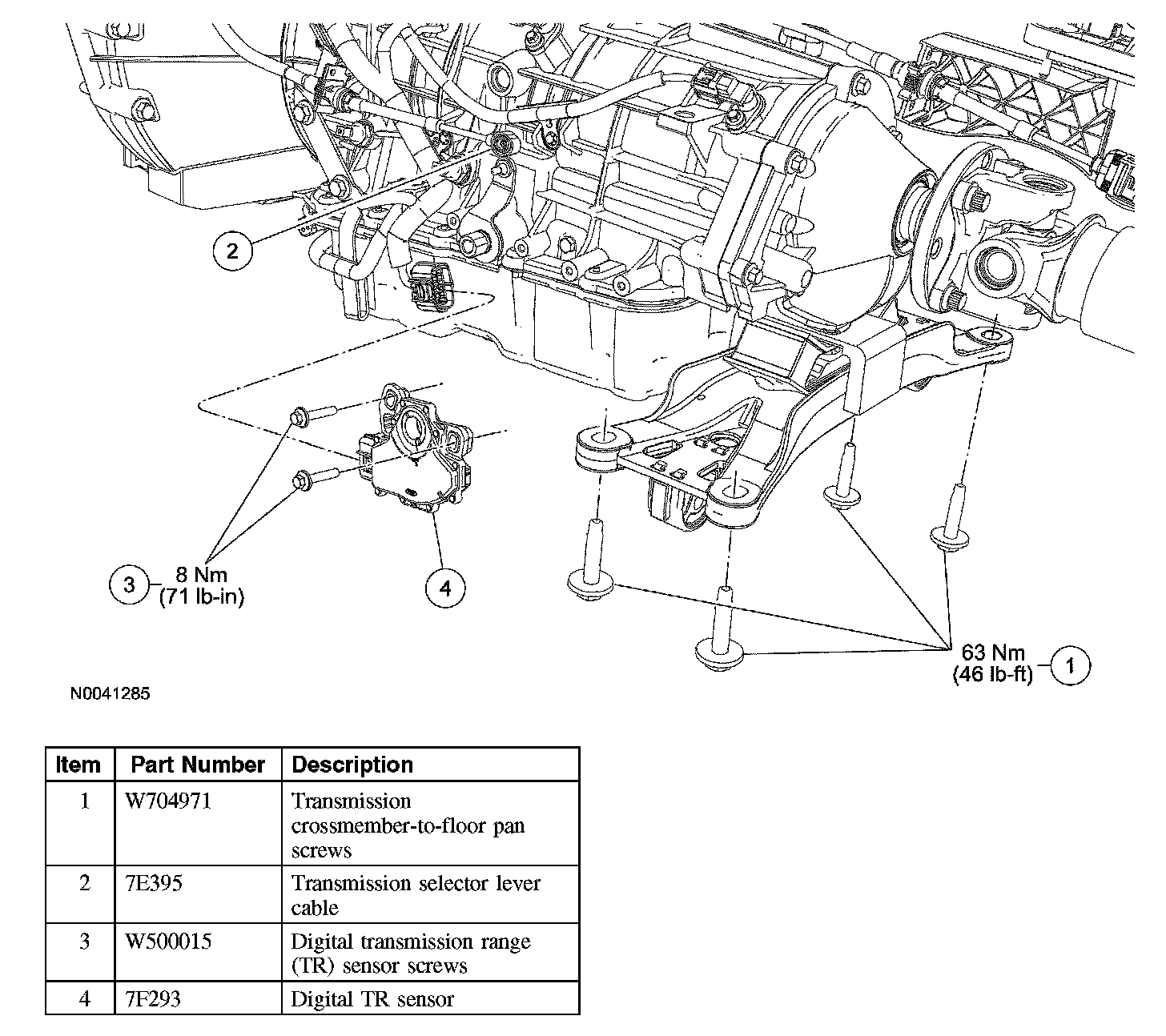 3. Remove the transmission crossmember-to-floor pan screws and lower the transmission enough to gain access to the TR sensor.
