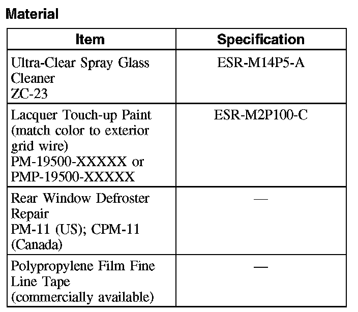 - If the brown color under the grid line is damaged or missing (this is very rare), it is necessary to apply acrylic lacquer touch-up paint for color match. This paint must meet specification ESR-M2P100-C and should be applied to the glass prior to applying the rear window defroster repair compound.
