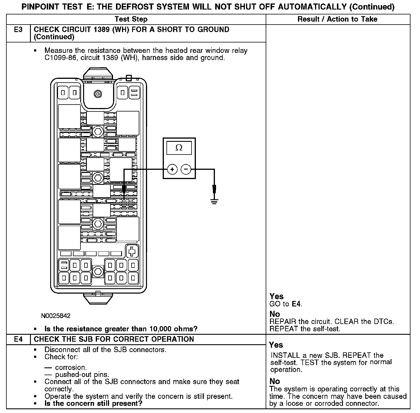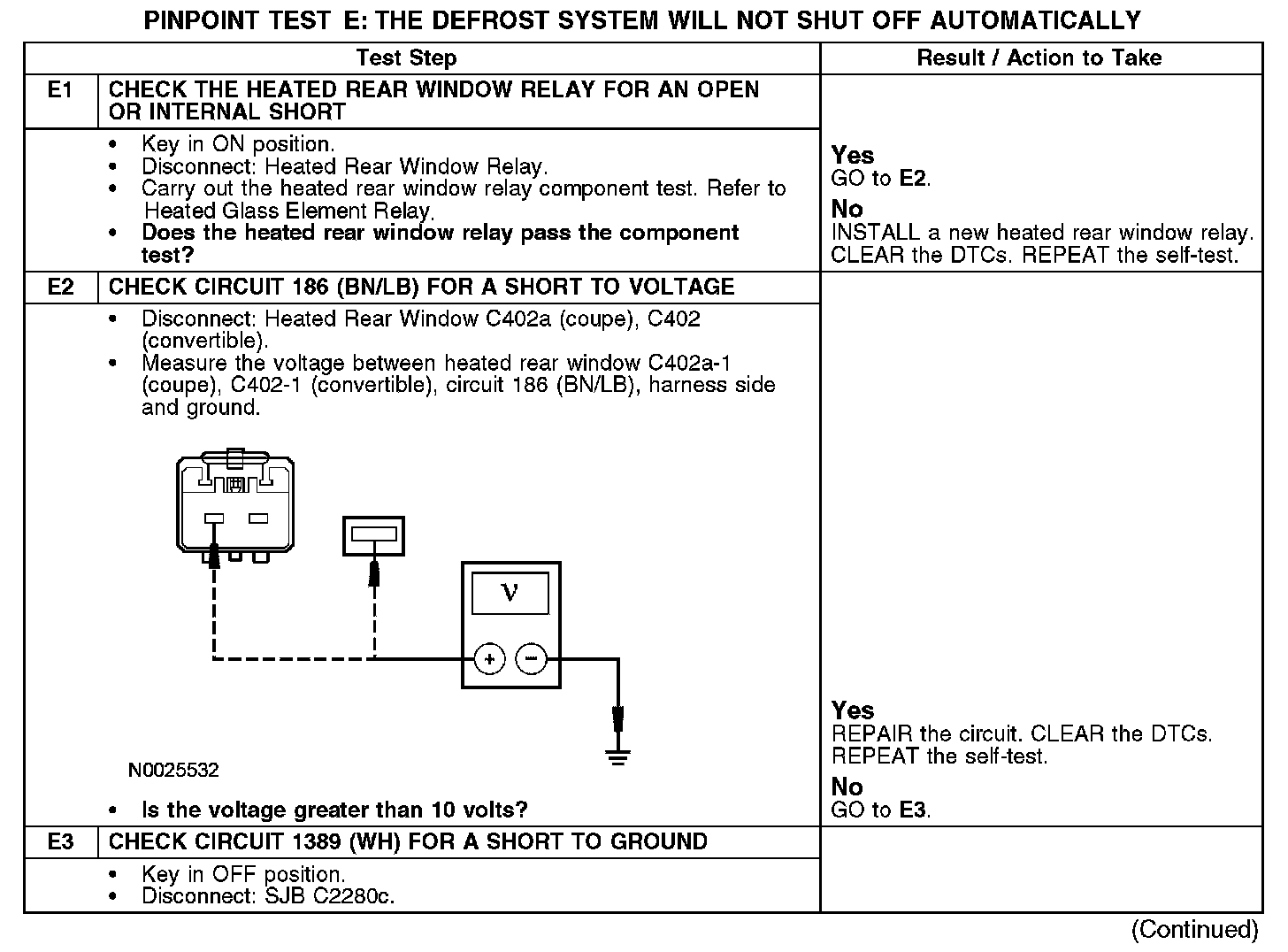When the rear defrost switch on the climate control assembly is pressed, a signal is sent to the smart junction box (SJB) to ground circuit 1389 (WH). This closes the heated rear window relay, allowing voltage to be supplied to the heated rear window grid through circuit 186 (BN/LB). The heated rear window grid is grounded by circuit 1205 (BK).