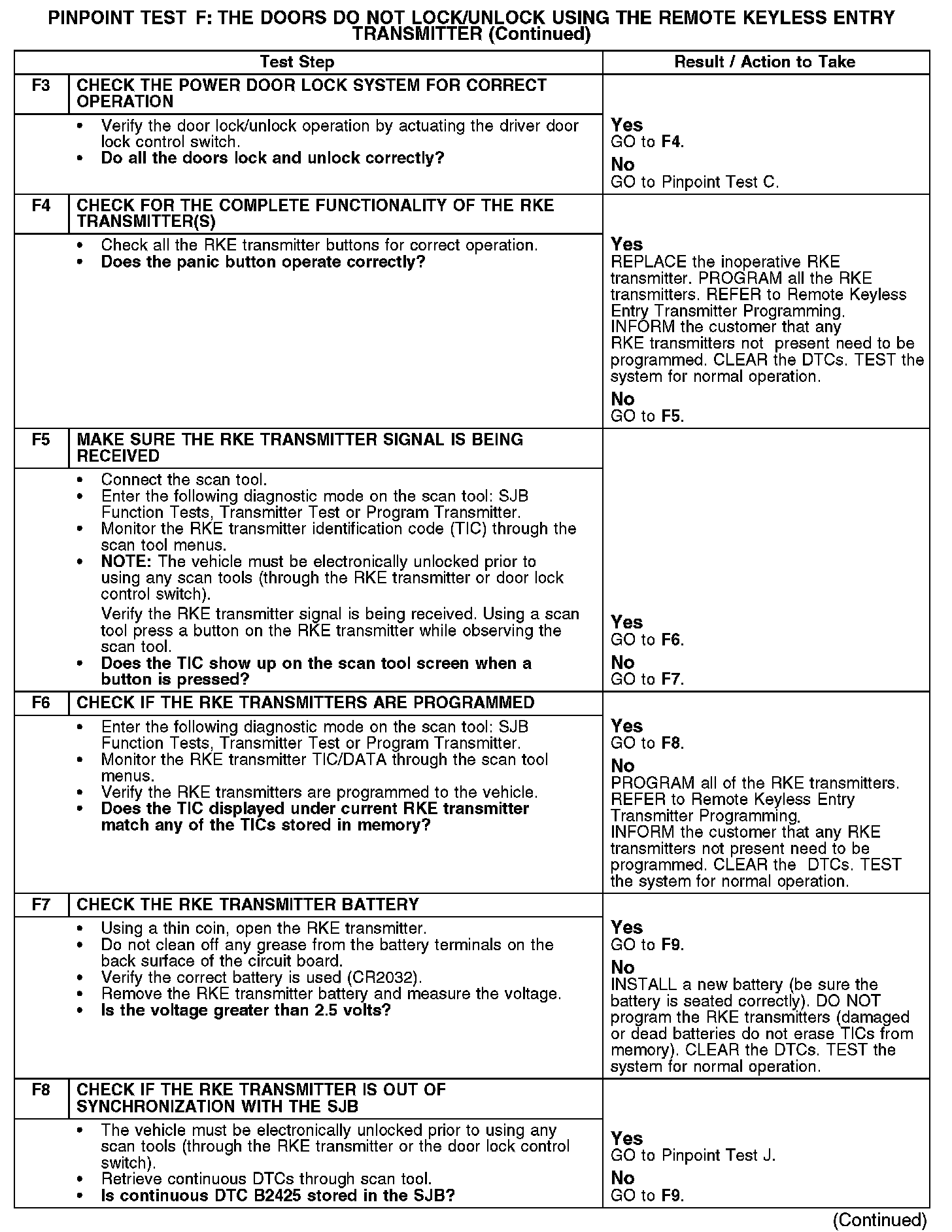 Pinpoint Test F: The Doors Do Not Lock/Unlock Using The Remote Keyless Entry TransmitterF1-F2: