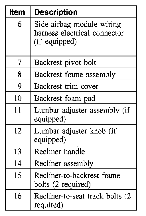 10. WARNING: Front seat backrest trim covers installed on seats equipped with side air bags cannot be repaired. New trim covers are to be installed (cleaning is permissible).