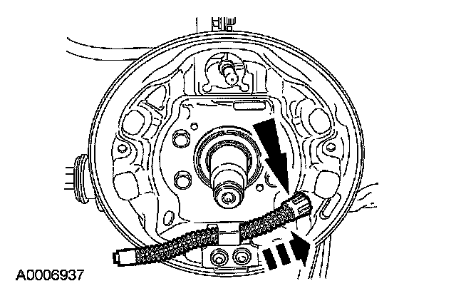 4. Unclip the parking brake cable and conduit from the brake backing plate and route the cable and conduit out of the backing plate.