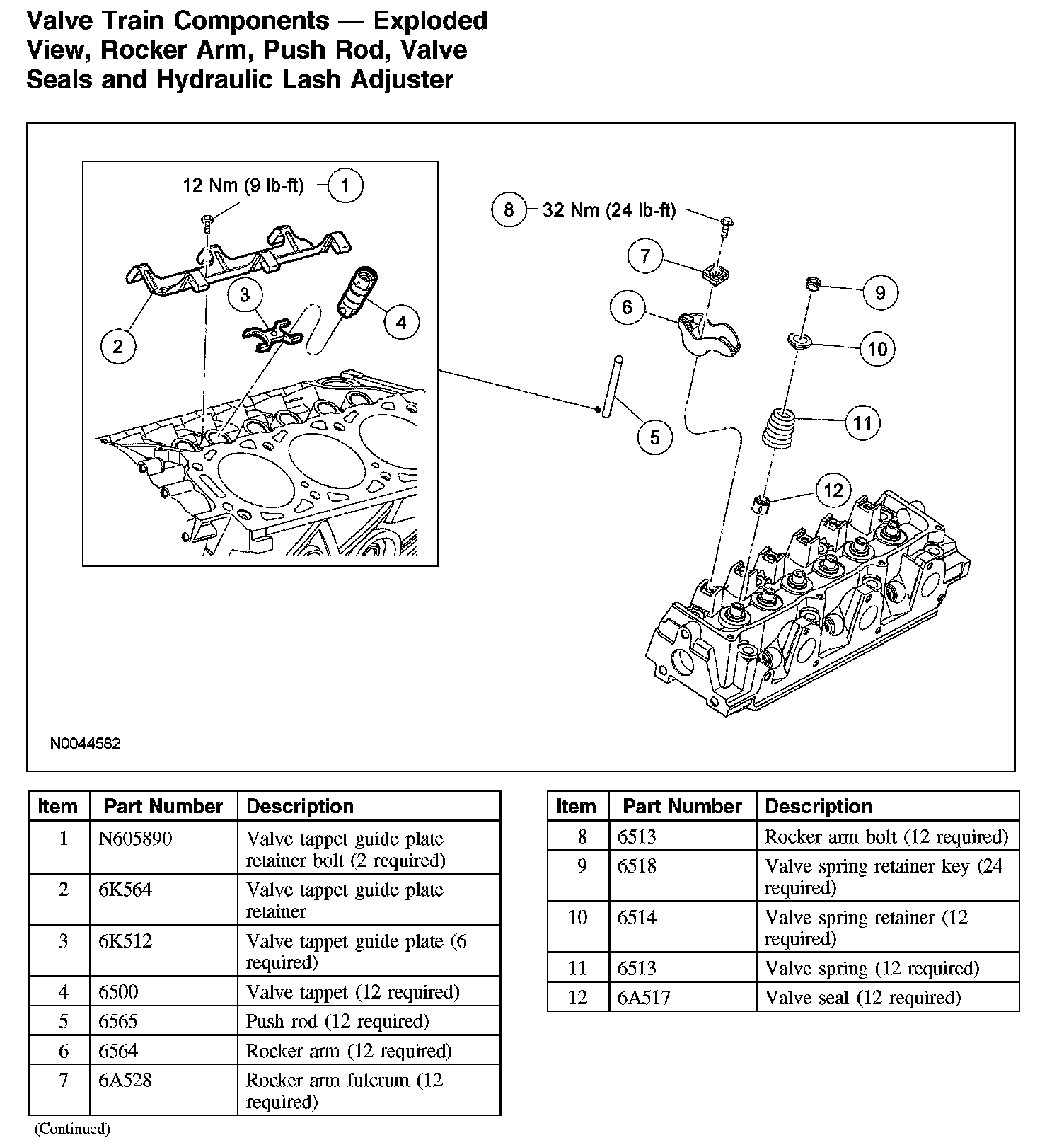 Valve Train Components - Exploded View, Rocker Arm, Push Rod, Valve Seals and Hydraulic Lash Adjuster:
