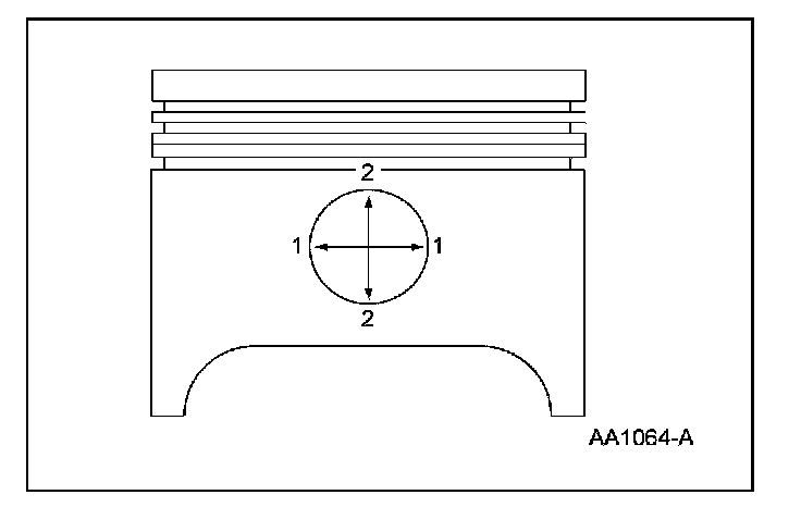 1. Measure the piston diameter 90 degrees from the piston pin and 42 mm (1.65 inch) down from the top of the piston at the point indicated.