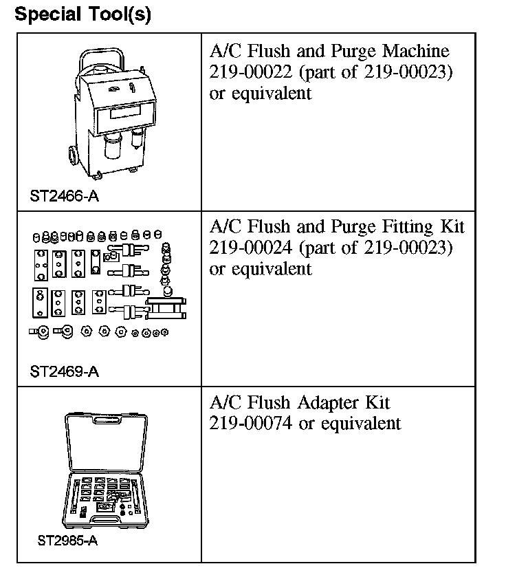 - Only the A/C Flush and Purge Machine kit 219-00023, which includes A/C Flush and Purge Machine 219-00022, A/C Flush and Purge Fitting Kit 219-00024 and A/C Systems Flushing Solvent, is approved for use on Ford vehicles. No other flushing device or solvent is approved for flushing heat exchangers (A/C condenser, A/C evaporator). Use of any other flusher or solvent may cause damage to the A/C system and the flushing unit.