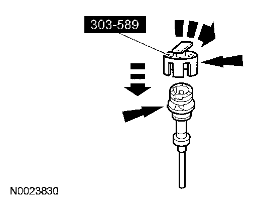 Install the special tool on the camshaft synchronizer by rotating the tool until it engages the notch in the camshaft synchronizer housing and the armature.