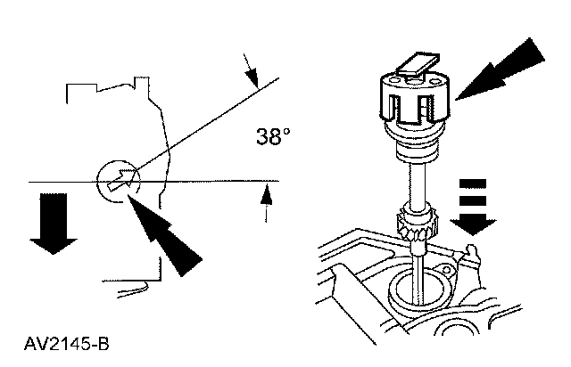 Install the camshaft synchronizer housing assembly so the arrow on the special tool is 38 degrees from the centerline of the engine.