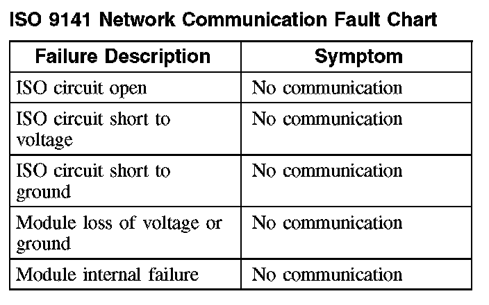 The fault chart describes the specific ISO 9141 network failures and their resulting symptom.