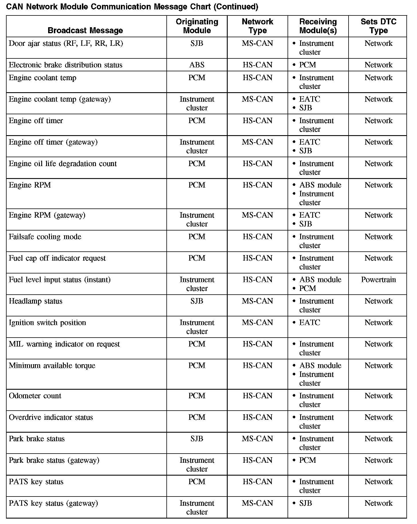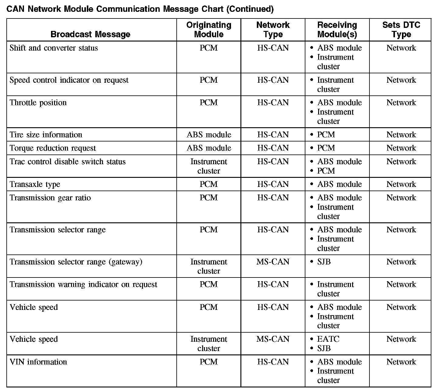 The HS-CAN network uses an unshielded twisted pair cable of data (+) and data (-) circuits. The data (+) and the data (-) circuits are each regulated to approximately 2.5 volts during neutral or rested network traffic. As bus messages are sent on the data (+) circuit, voltage is increased by approximately 1.0 volt. Inversely, the data (-) circuit is reduced by approximately 1.0 volt when a bus message is sent. Multiple bus messages can be sent over the network CAN circuits allowing multiple modules to communicate with each other. The HS-CAN is a high speed communication network used for instrument cluster, powertrain control module (PCM) and anti-lock brake system (ABS) module communications, and designed for real time information transfer and control. The HS-CAN network will not communicate while certain faults are present, but will operate with diminished performance with other faults present. The HS-CAN bus may remain operational when 1 of the 2 termination resistors are not present.