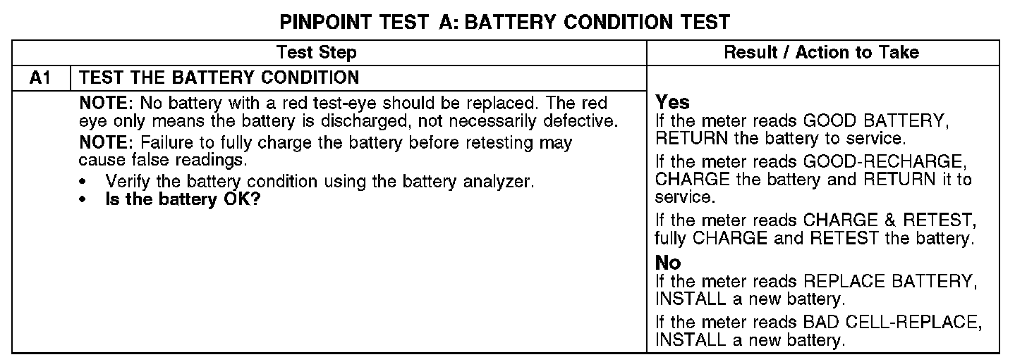 PINPOINT TEST A: BATTERY CONDITION TEST