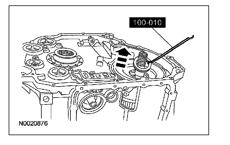 Position the special tool into the case and install the hook end of tool into one of the lube holes in the front sun shell. Position the block over the edge of the assembly and tighten the handle.