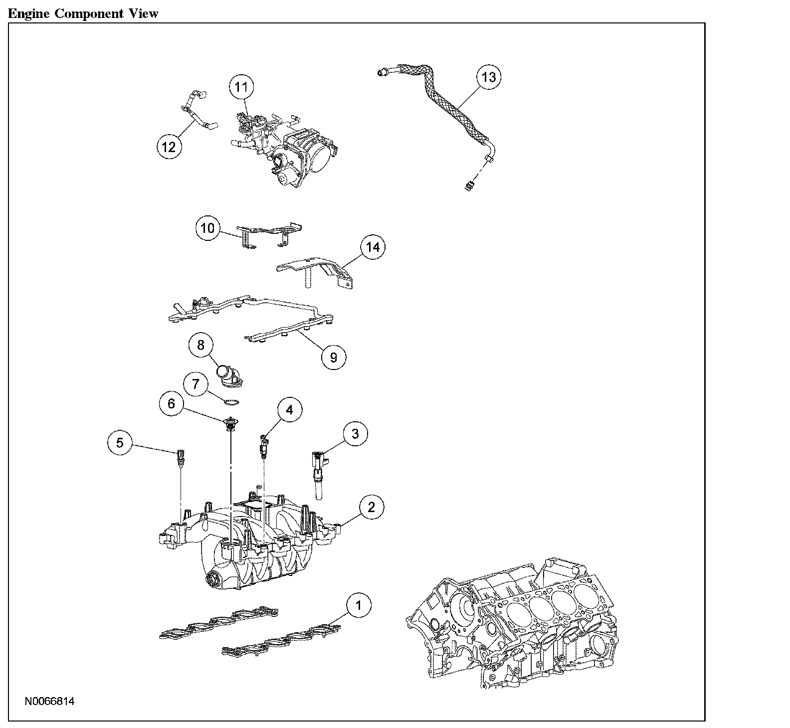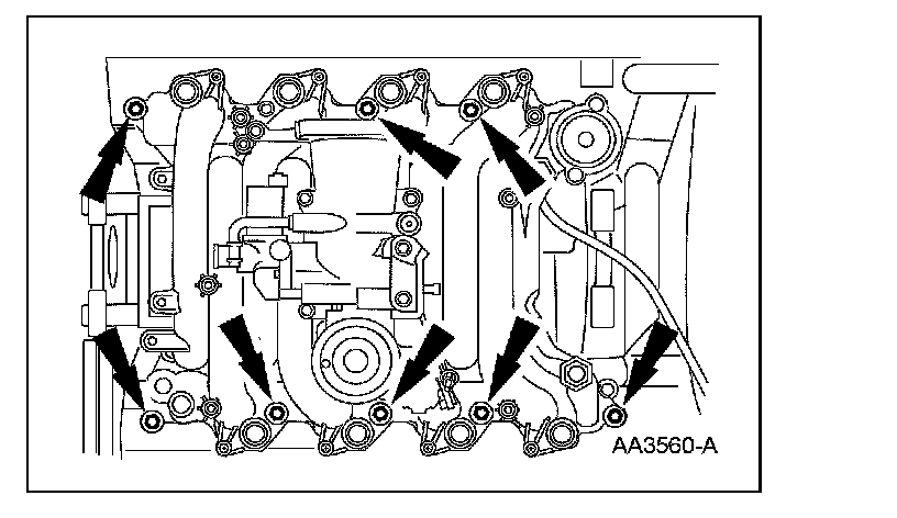 Install the new intake manifold gaskets, intake manifold and hand-tighten the 8 bolts at the locations shown.