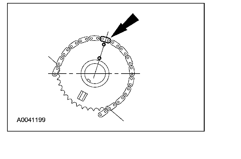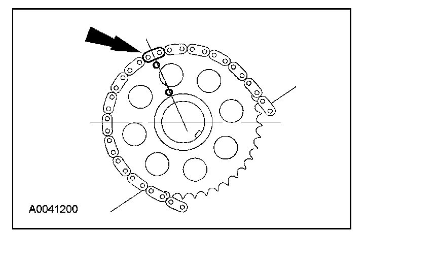 41. Install the LH timing chain on the camshaft sprocket, aligning the colored (marked) link with the timing marks on the sprocket.