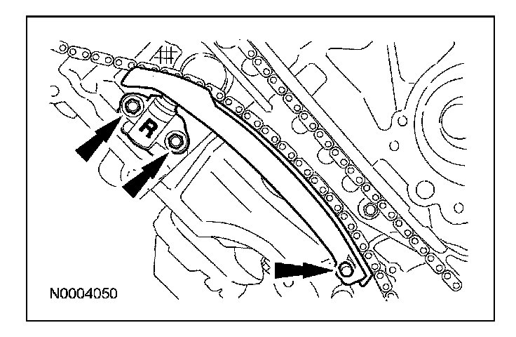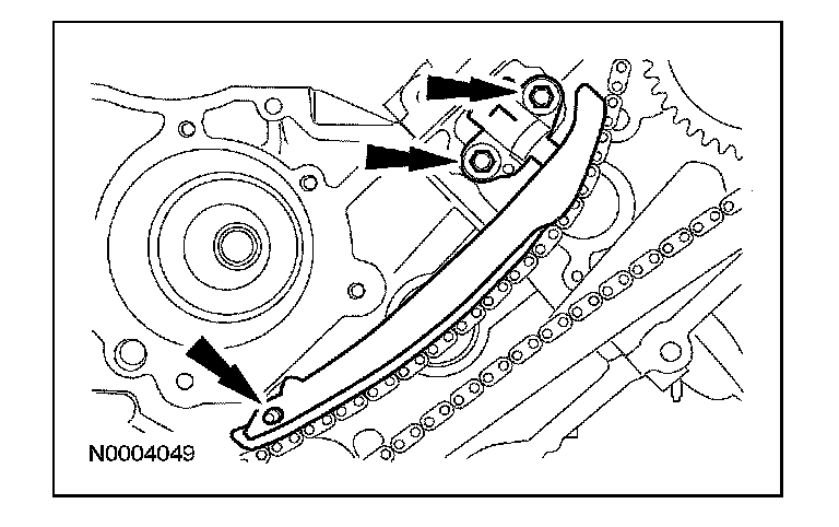 47. Position the RH timing chain tensioner arm on the dowel pin and install the RH timing chain tensioner and 2 bolts.