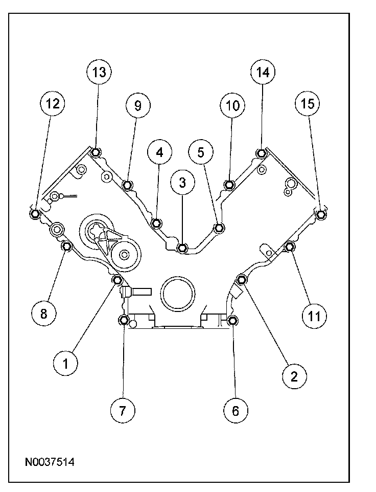 59. Tighten the 15 front cover fasteners in the sequence shown to 25 Nm (18 ft. lbs.).