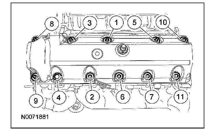 75. Install the new RH gasket into the valve cover and position on the cylinder head. Tighten the 11 bolts in the sequence shown.