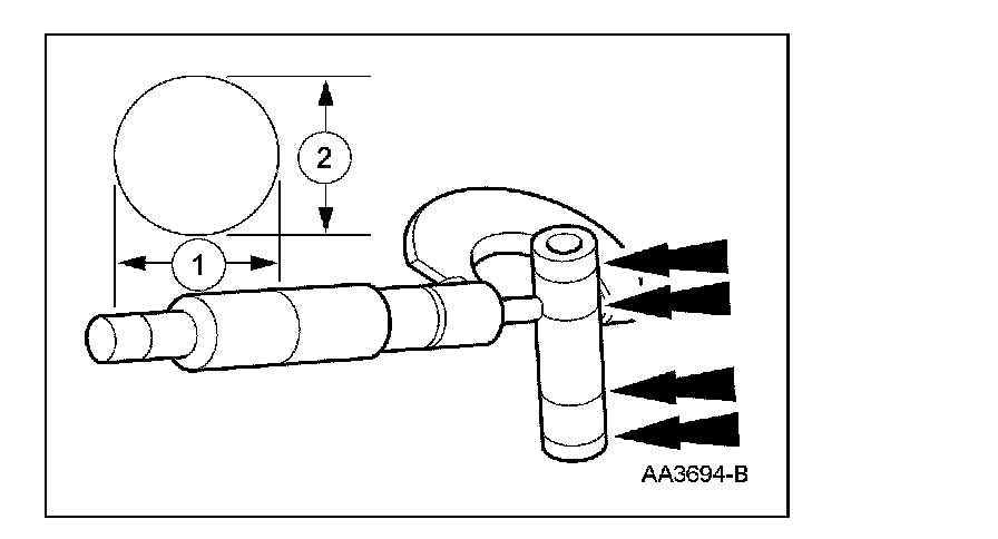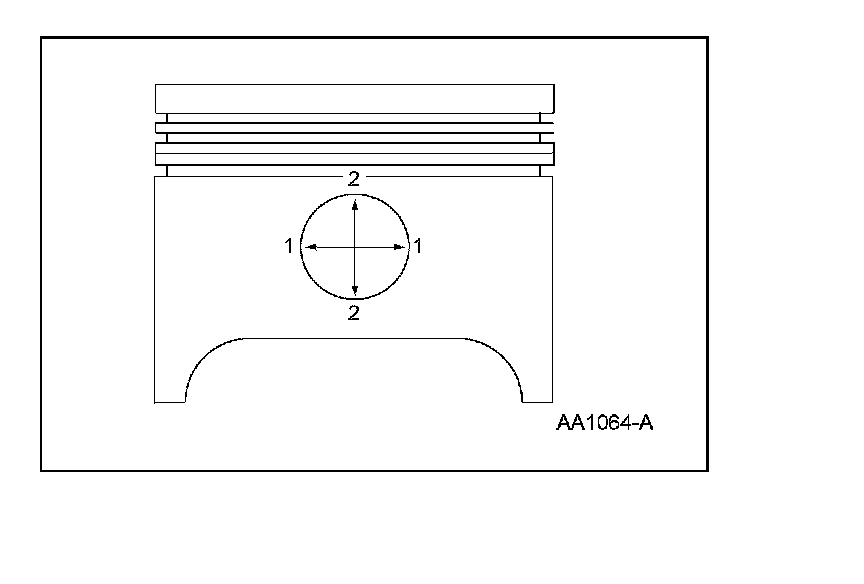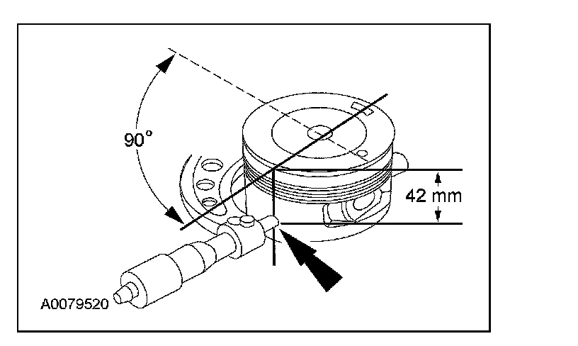 1. Measure the piston diameter 90 degrees from the piston pin and 42 mm (1.65 inch) down from the top of the piston at the point indicated.
