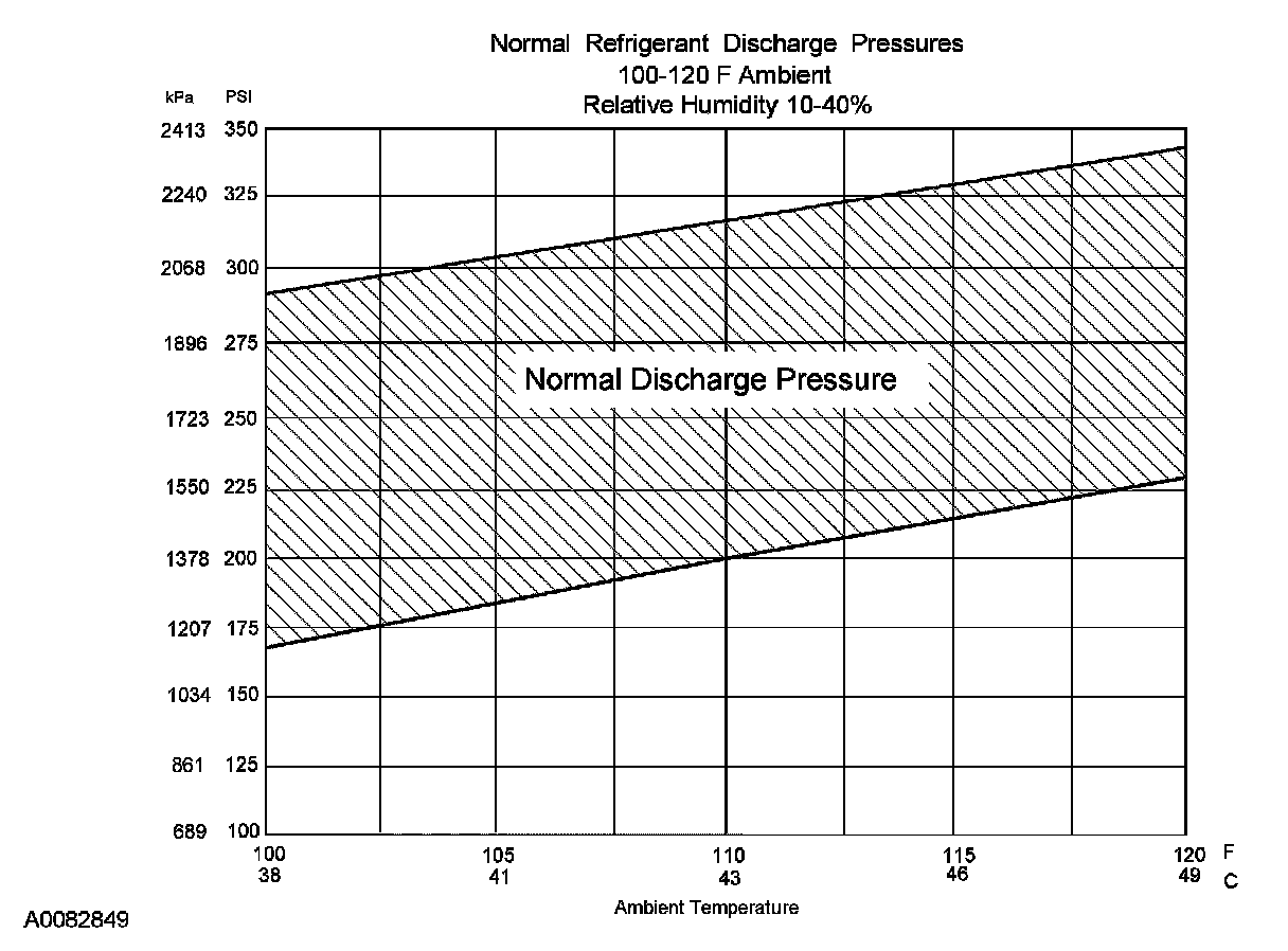 8. Determine if the discharge pressure falls within the normal operating limits using the Normal Refrigerant Discharge Pressures chart.