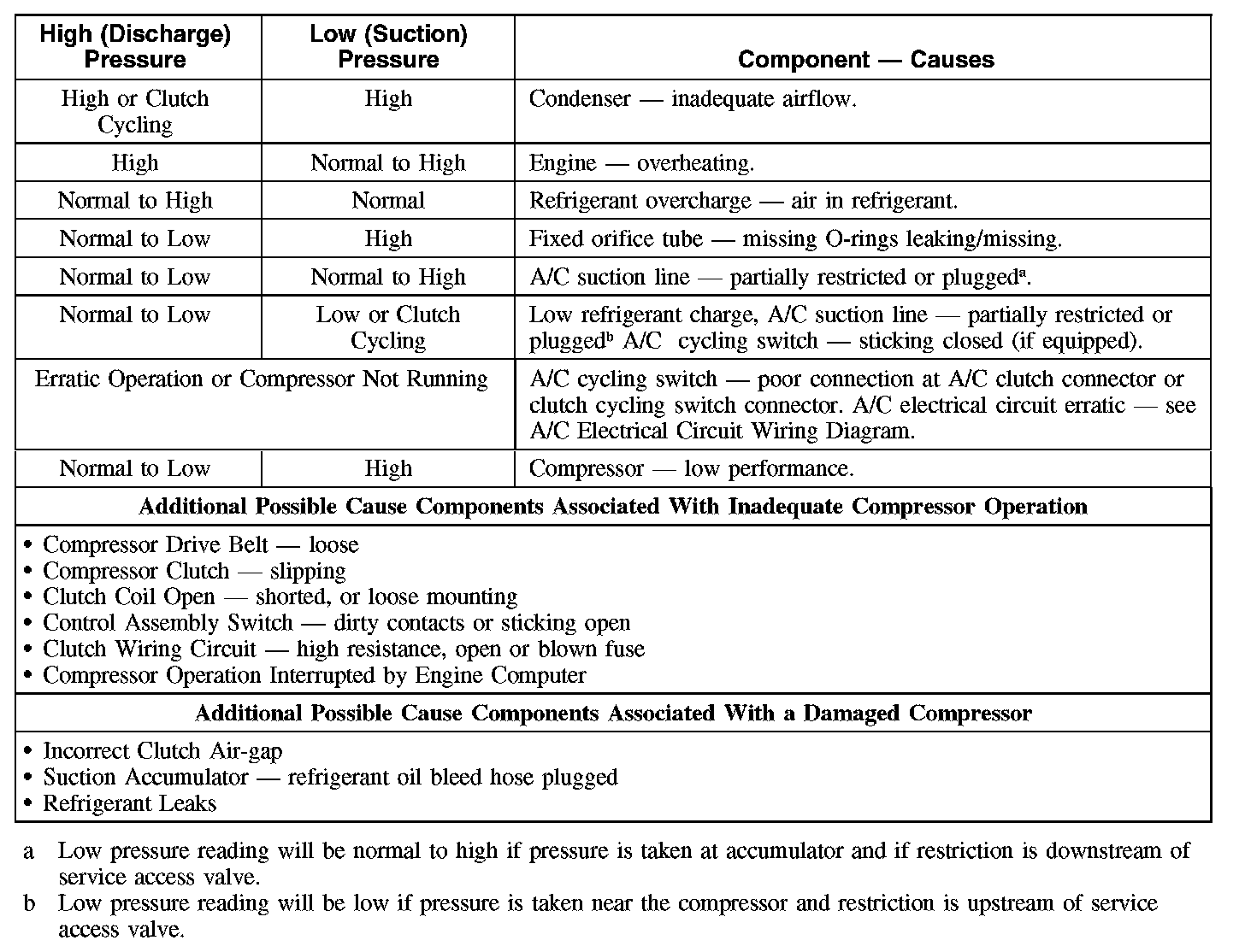 1. NOTE: The following table is used to guide diagnosis of the refrigerant system if operating pressures are outside normal limits.