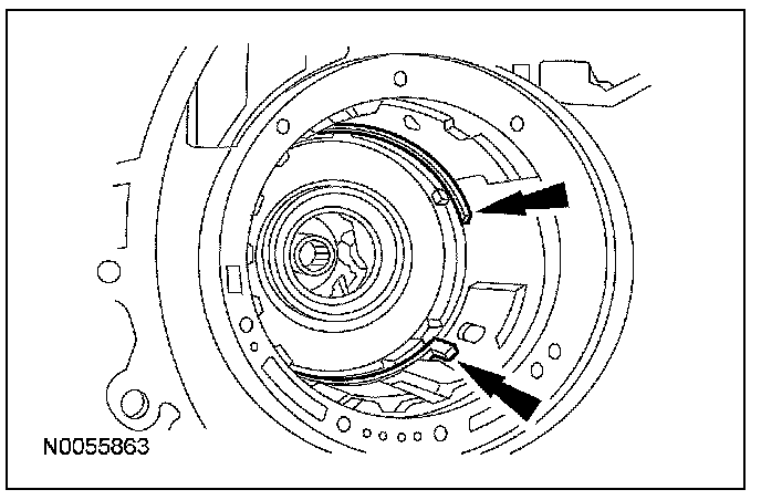 Using the special tool, compress the piston spring, then remove the overdrive servo piston retainer.