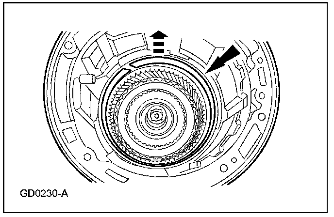 19. Using the special tool, remove the reverse band servo retaining ring.