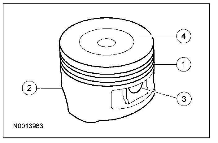 1. Clean and inspect the (1) ring lands, (2) skirts, (3) pin bosses and the (4) tops of the pistons. If wear marks, scores or glazing is found on the piston skirt, check for a bent or twisted connecting rod.