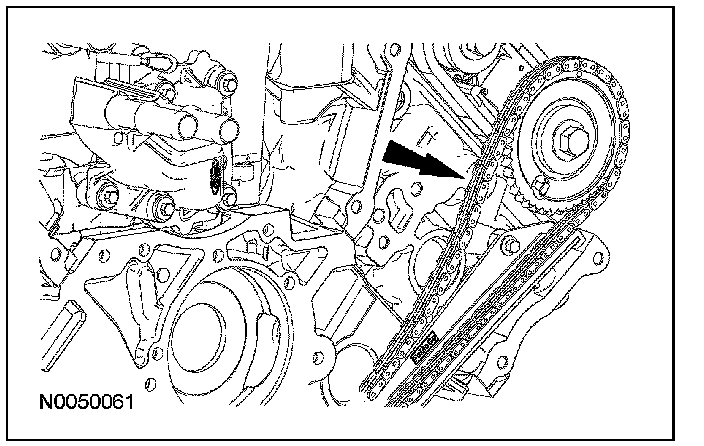 13. Install the LH primary timing chain tensioner and the 2 bolts.