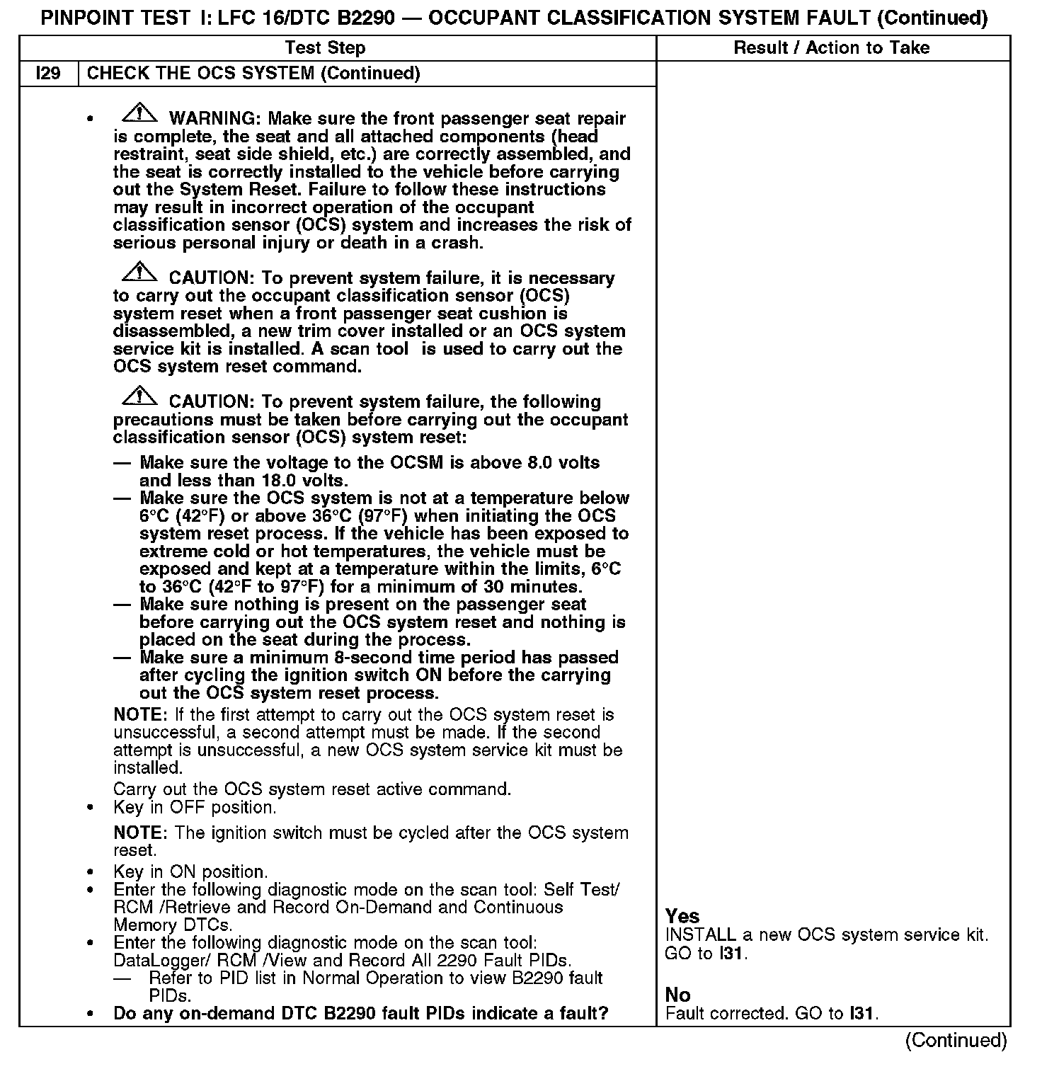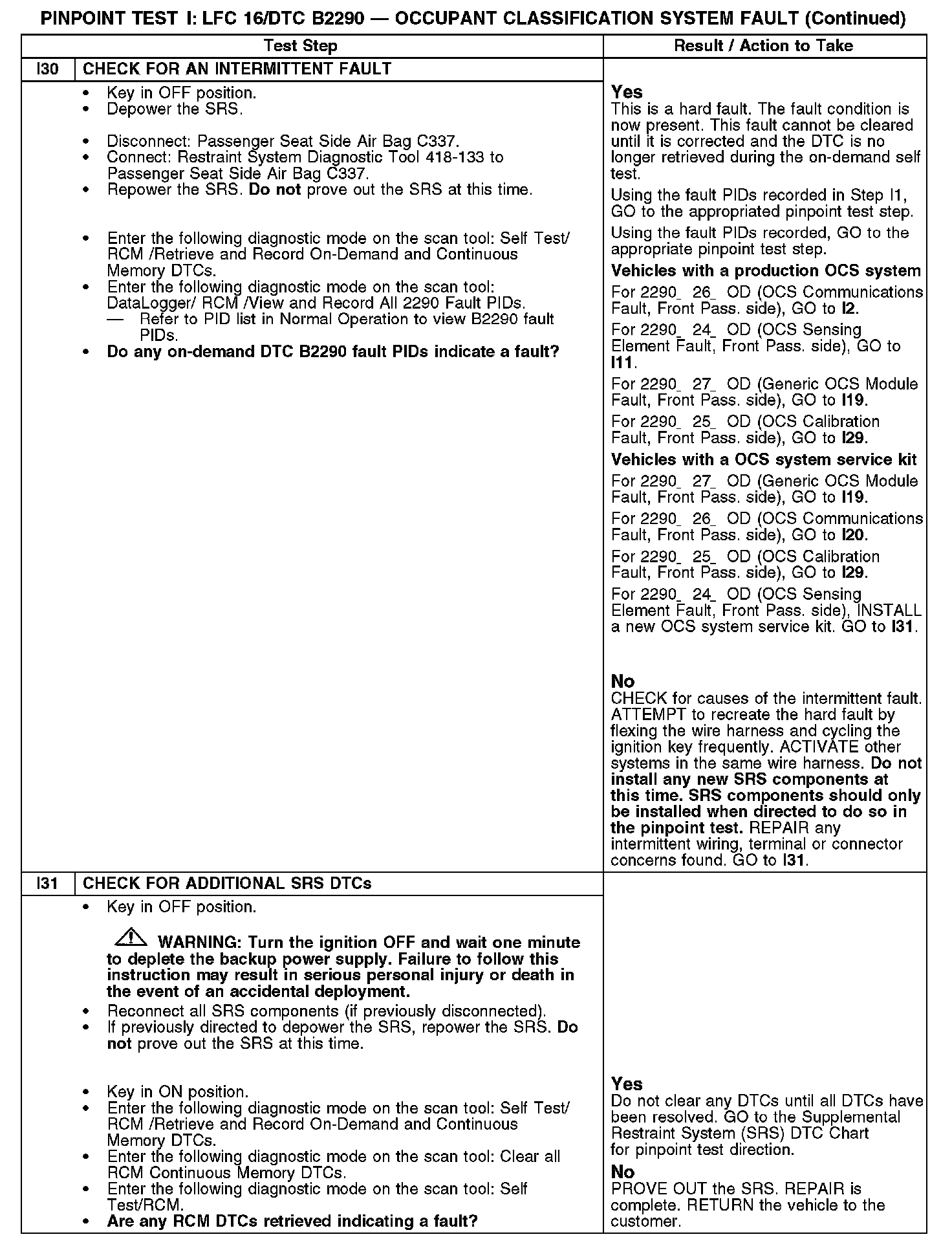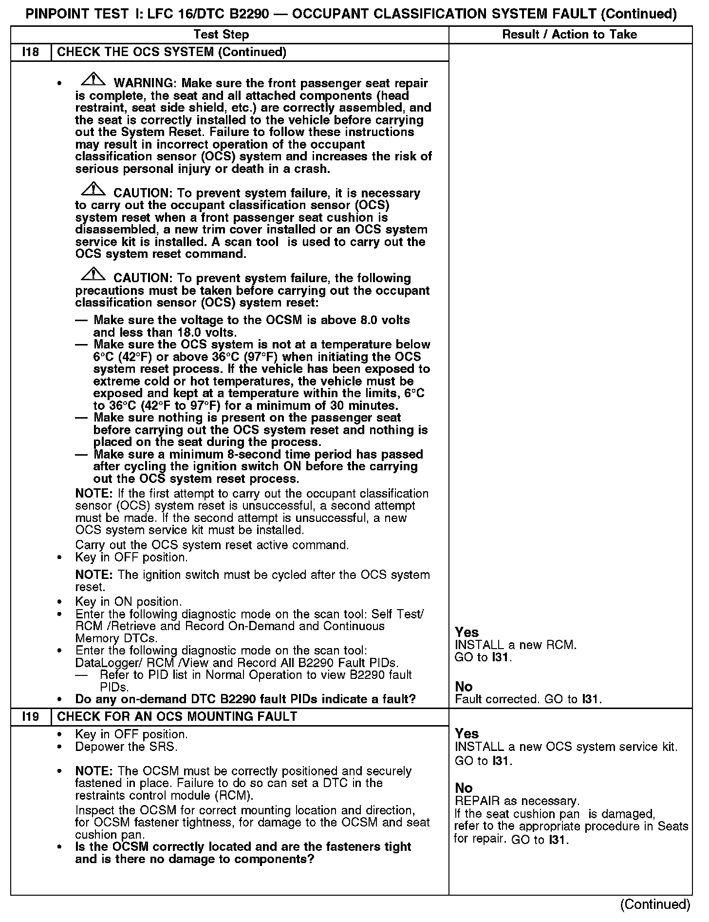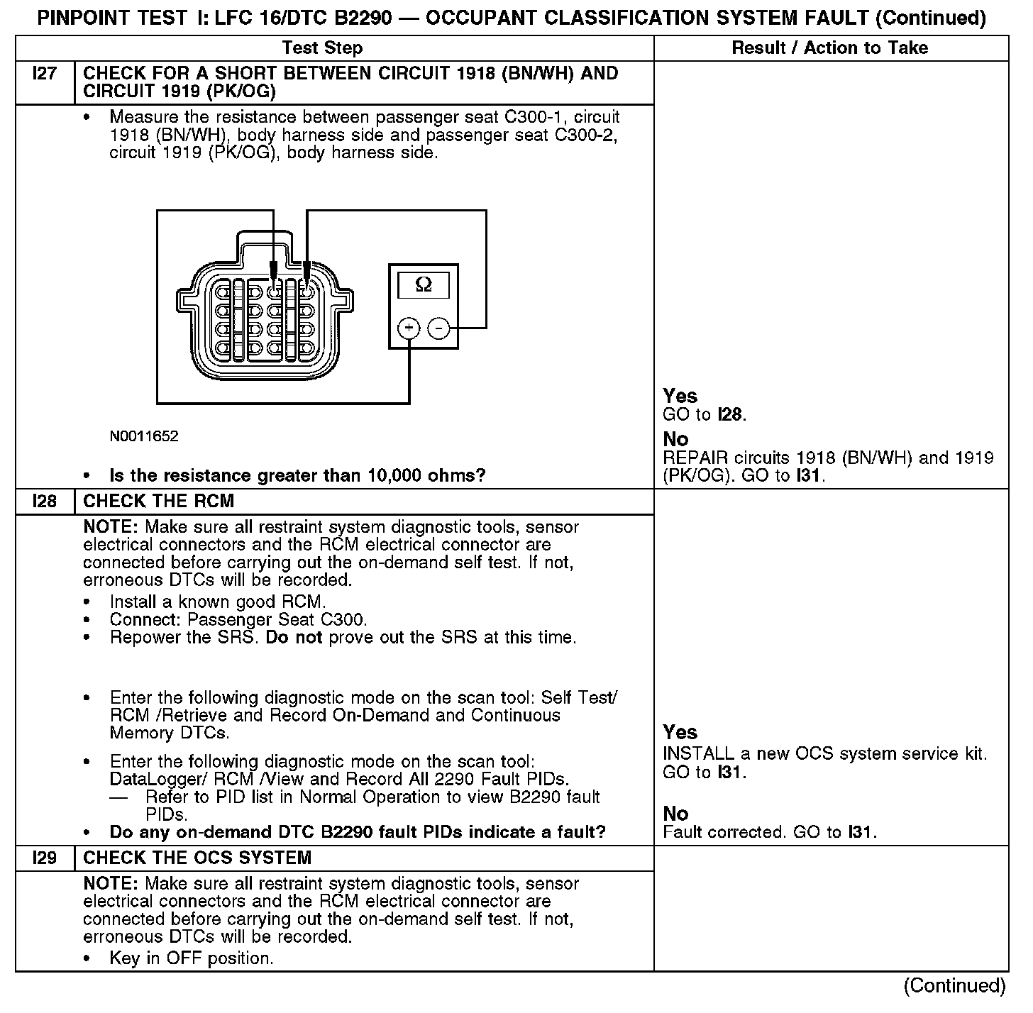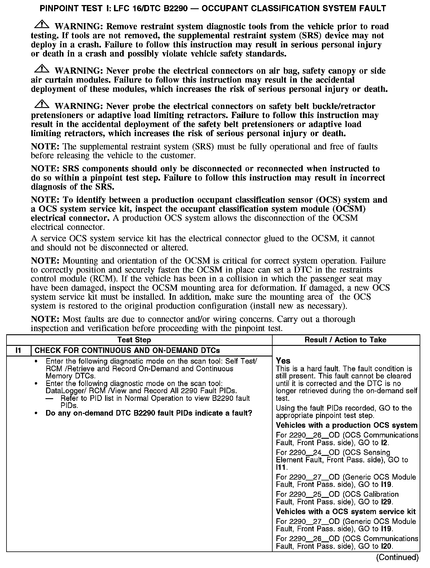 PINPOINT TEST I: LFC 16/DTC B2290 - OCCUPANT CLASSIFICATION SYSTEM FAULTNOTE: LFC 16 is shared between DTC B2290 and DTC B2909.