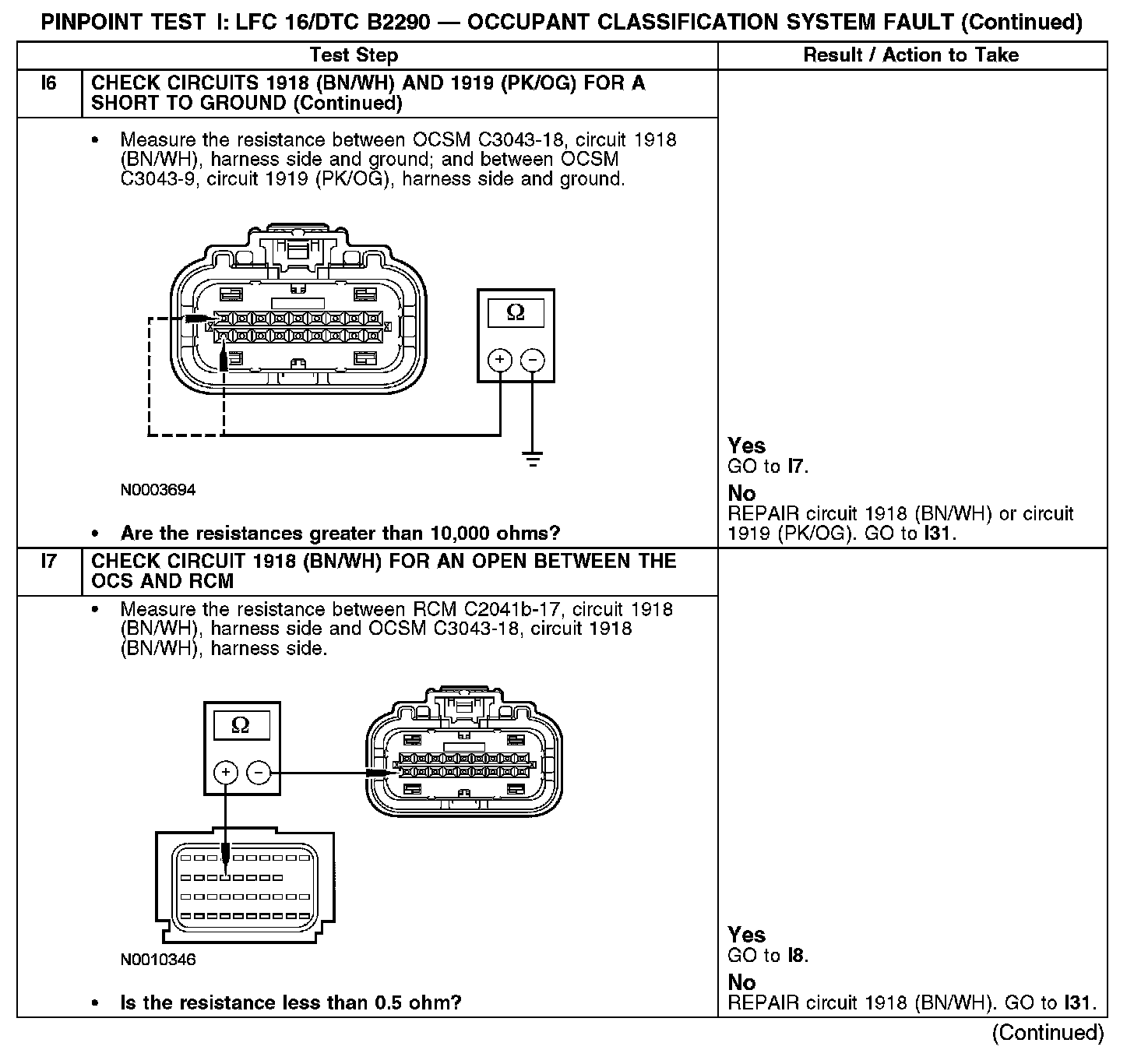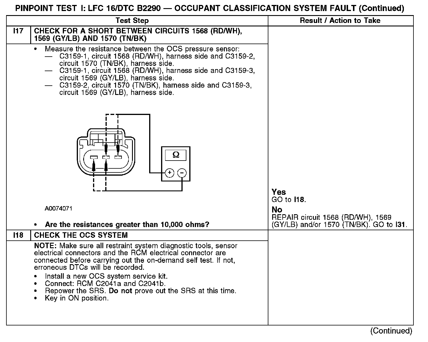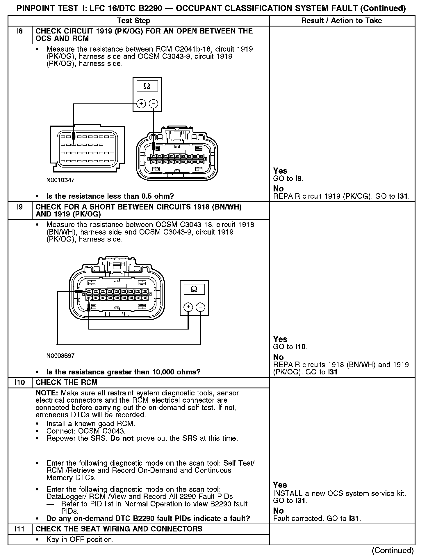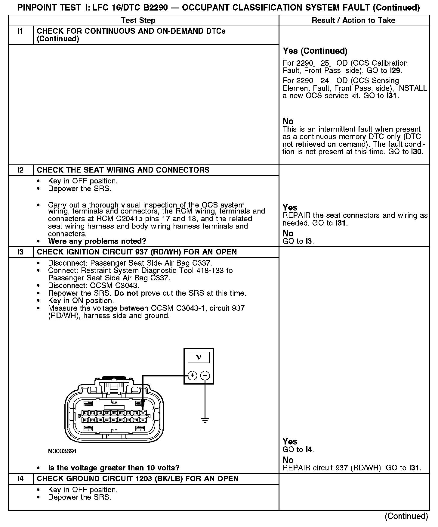 PINPOINT TEST I: LFC 16/DTC B2290 - OCCUPANT CLASSIFICATION SYSTEM FAULTNOTE: LFC 16 is shared between DTC B2290 and DTC B2909.