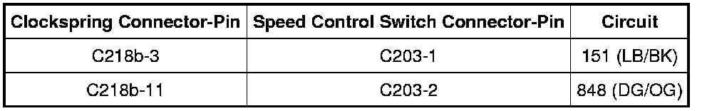 - If equipped with remote audio/climate control switches, measure the resistance between the clockspring C218b, harness side and the speed control switch C203, harness side as follows: