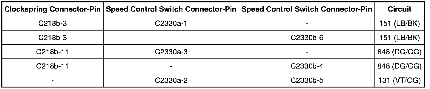 - If not equipped with remote audio/climate control switches, measure the resistance between the clockspring C218b, harness side and the speed control switch; and between the speed control switch C2330a, harness side and the speed control switch C2330b, harness side as follows: