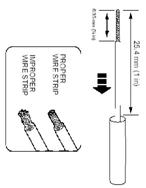 2. Strip 6.35mm (1/4 in) of insulation from each wire end, taking care not to nick or cut wire strands.