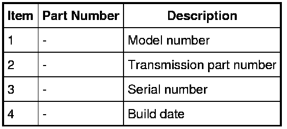 All transmissions are equipped with an identification tag located on the transmission case. For model number, transmission part number, serial number and build date, refer to the transmission identification tag located on the transmission case.