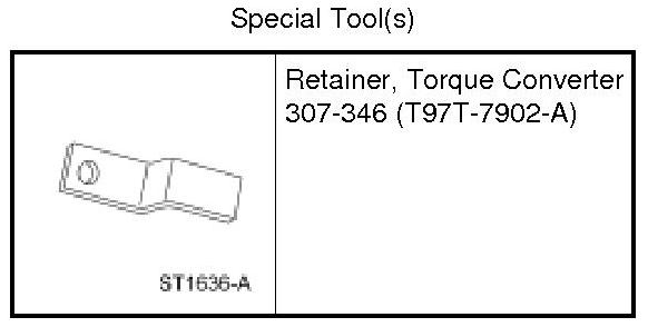 1. WARNING: Secure the torque converter in the transmission during removal or installation. The torque converter is heavy and may result in injury if it falls out of the transmission. Failure to follow this instruction may result in serious personal injury.