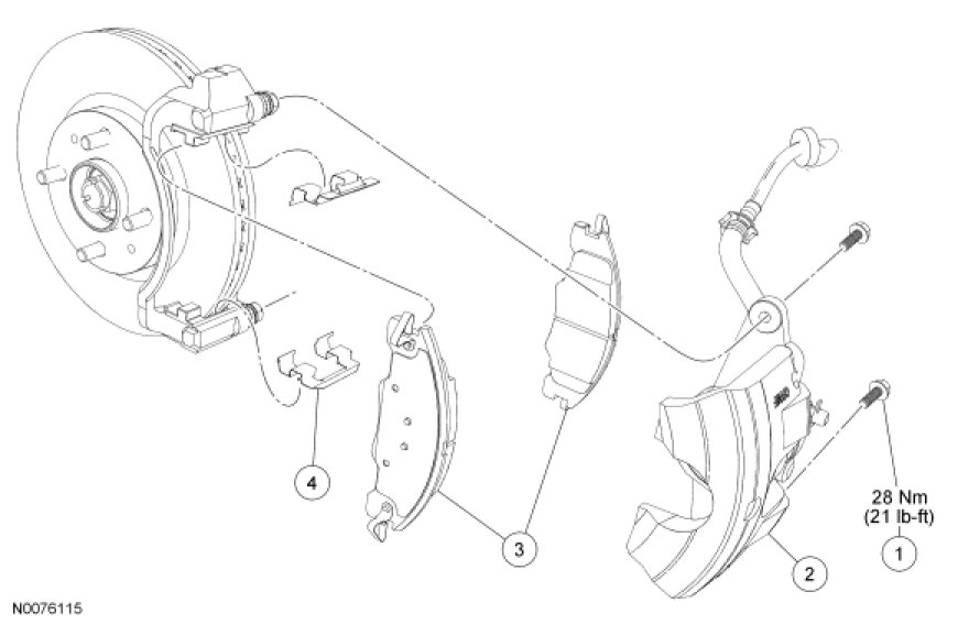 NOTICE: Do not allow the brake caliper to hang from the brake caliper flexible hose or damage to the hose can occur.