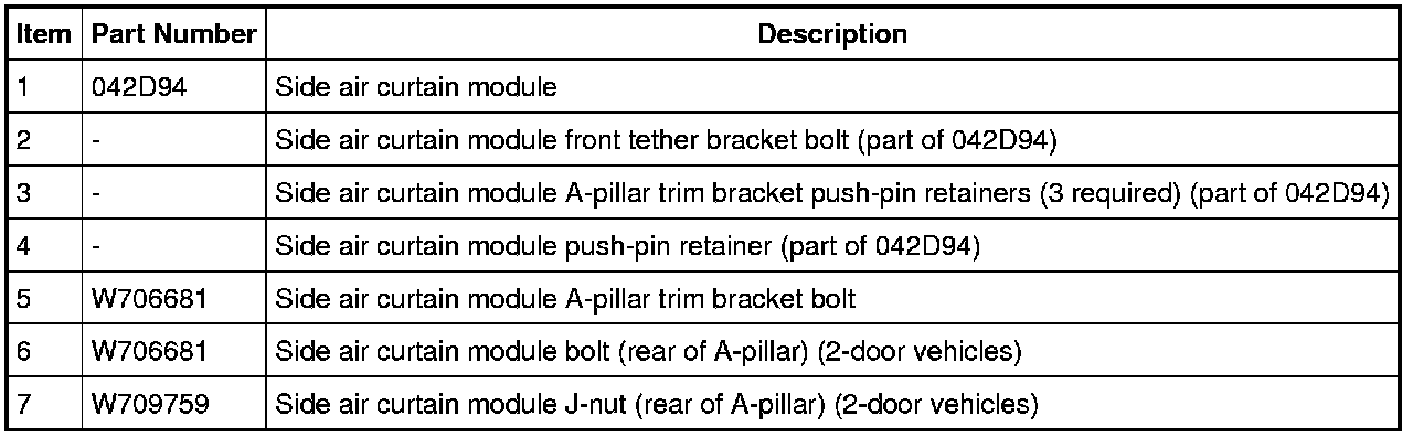 WARNING: Anytime the Safety Canopy(R) or side air curtain module has deployed, a new headliner and new A-, B- and C-pillar upper trim panels and attaching hardware must be installed. Remove any other damaged components and hardware and install new components and hardware as needed. Failure to follow these instructions may result in the Safety Canopy(R) or side air curtain module deploying incorrectly and increases the risk of serious personal injury or death in a crash.