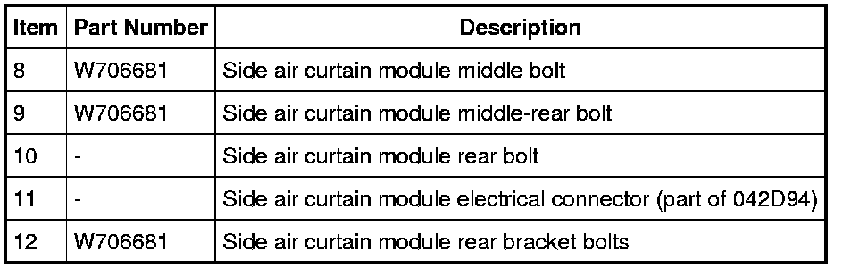 9. Remove the side air curtain module middle bolt and middle-rear bolt.