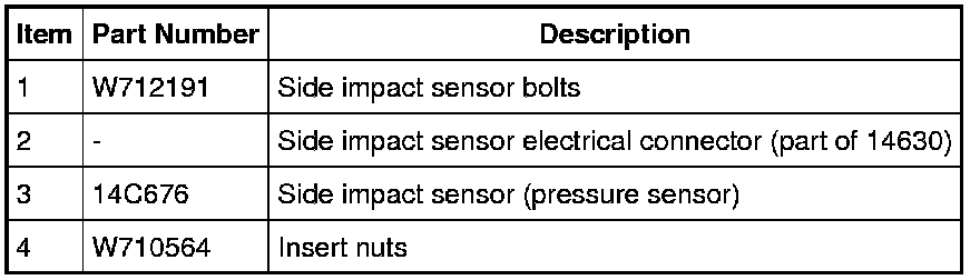 4. NOTICE: To prevent stripping the insert nuts, tighten the side impact sensor bolts only enough to retain the side impact sensor correctly.
