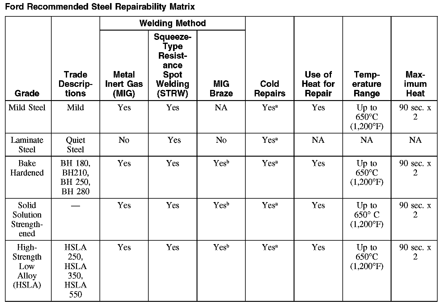Ford Recommended Steel Repairability Matrix (Part 1):
