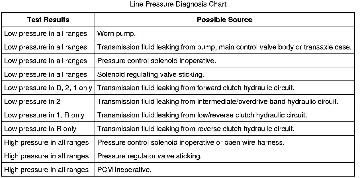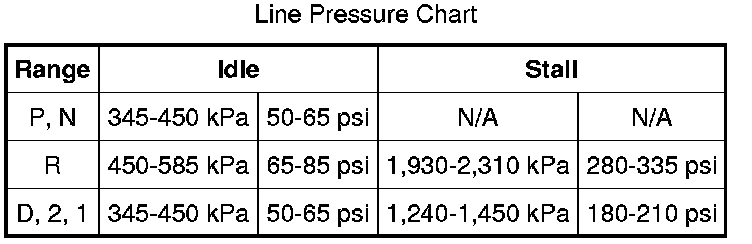 4. Start engine and check line pressures. Refer to the following Line Pressure Chart to determine if line pressure is within specifications.