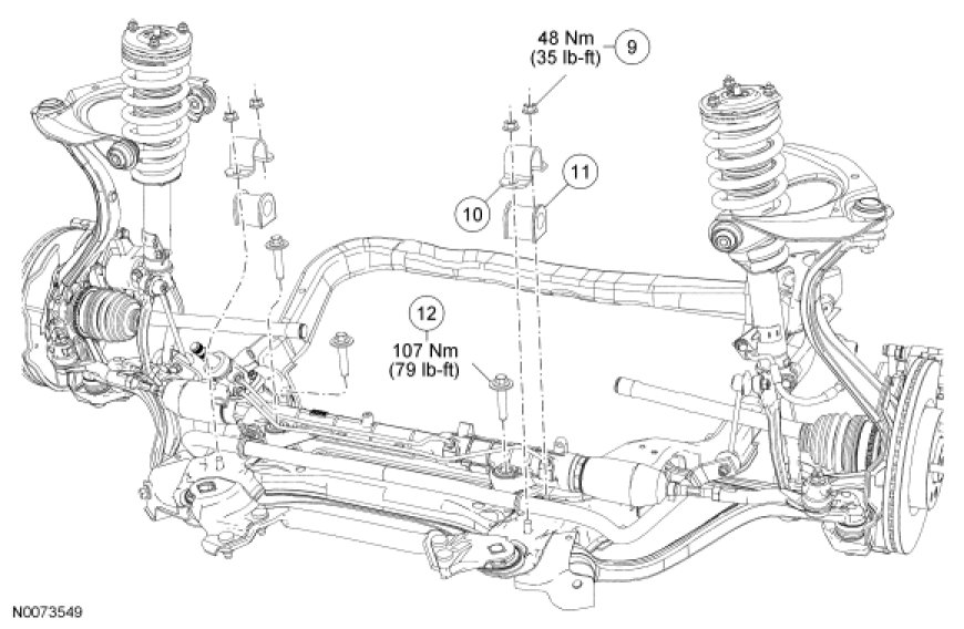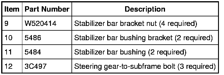 15. Remove the 2 LH steering gear-to-subframe bolts and position the steering gear to access the stabilizer bar LH bracket front nut.