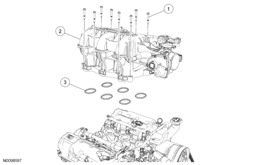 1. NOTICE: If the engine is repaired or replaced because of upper engine failure, typically including valve or piston damage, check the intake manifold for metal debris. If metal debris is found, install a new intake manifold. Failure to follow these instructions can result in engine damage.