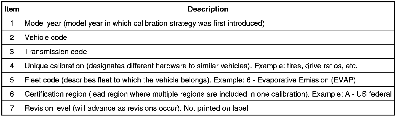 The Emissions/CAFE/CO2 Compliance Department is responsible for assigning these calibration numbers. Unique calibration identifications are assigned to cover similar vehicles to differentiate tires, drive configurations, final drive ratios and other calibration-significant factors.