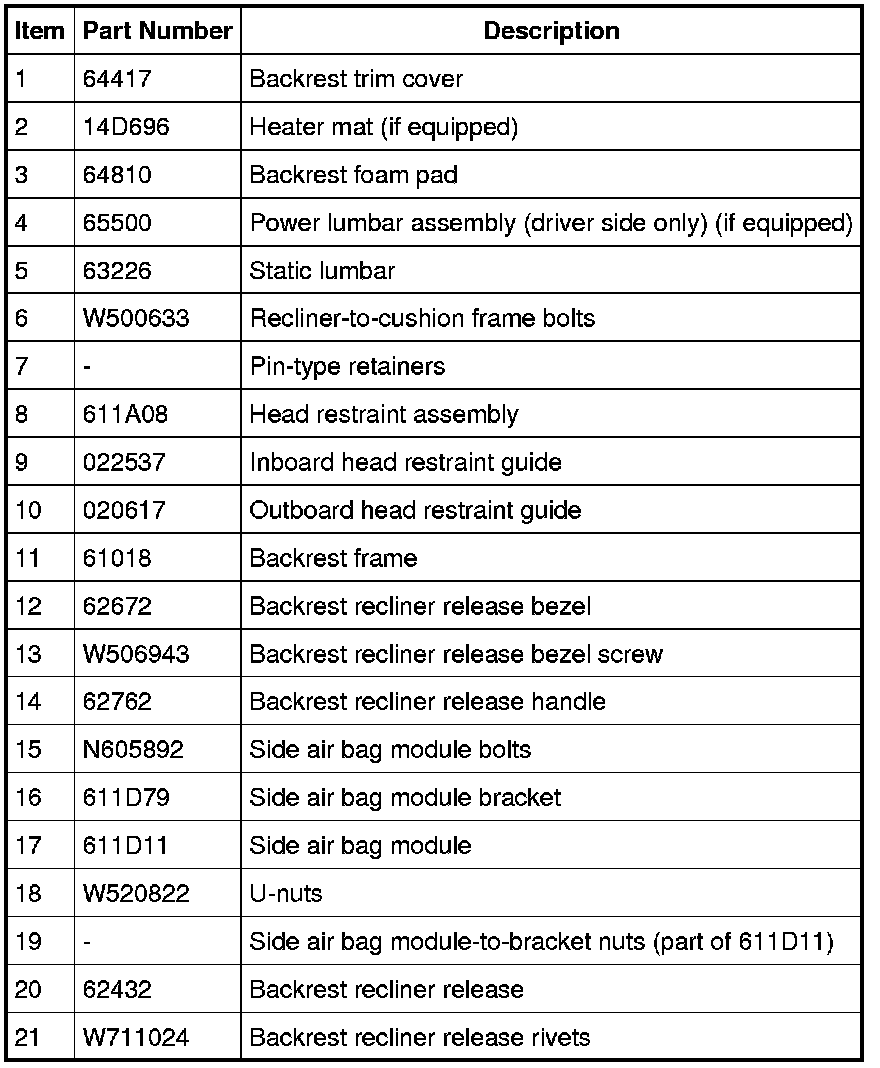 7. WARNING: Front seat backrest trim covers installed on seats equipped with seat side air bags cannot be repaired. A new trim cover must be installed. Cleaning is permissible. Failure to follow these instructions may result in the seat side air bag module deploying incorrectly and increase the risk of serious personal injury or death in a crash.
