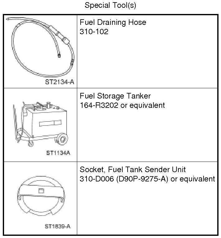 5. NOTE: This step will remove approximately one-eighth tank of fuel from a completely full fuel tank and the majority of any residual fuel from the fuel tank filler pipe. Also the fuel in the fuel tank will be below the Fuel Pump (FP) module mounting flange for FP module removal without fuel spillage.