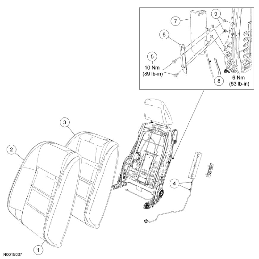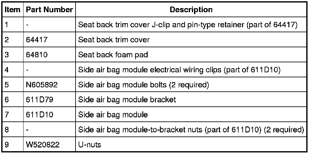 NOTE: If a side air bag deployment took place, a new seat back foam pad, trim cover, side air bag module, bracket and nuts, U-nuts and bolts must be installed. The seat back frame should be replaced if necessary.