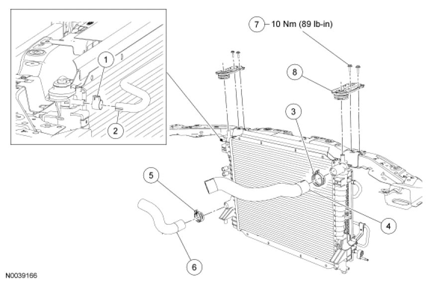 6. Disconnect the upper radiator hose from the radiator and position aside.
