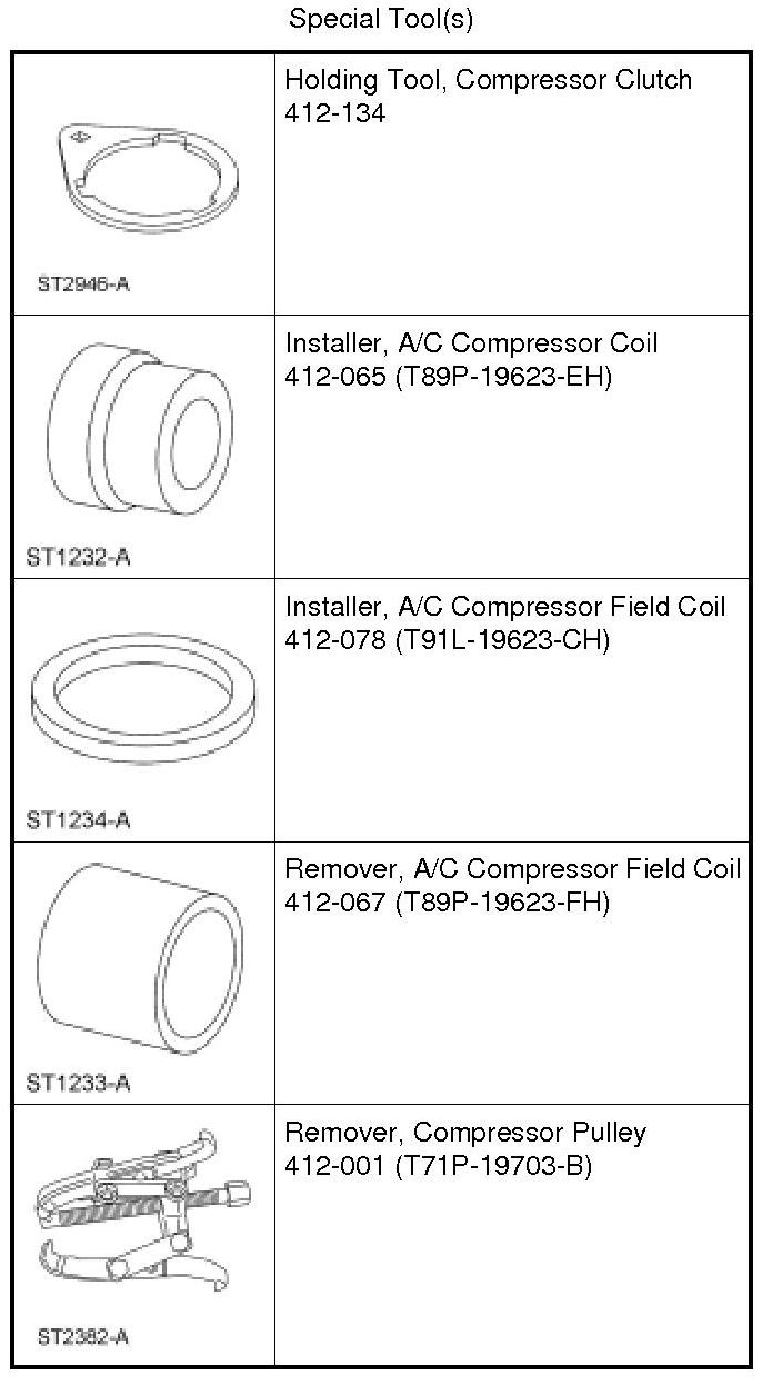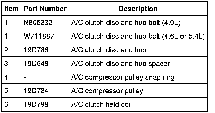 1. Remove the A/C compressor. For additional information, refer to Air Conditioning (A/C) Compressor - 4.0L Service and Repair or Air Conditioning (A/C) Compressor - 4.6L, 5.4L Service and Repair.